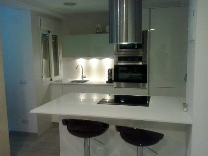 Otro de nuestros proyectos de cocina de obra nueva. Una cocina blanca, en la que el aprovechamiento del espacio se convierte en una máxima, y donde se consiguen ganar metros cuadrados visualmente gracias a la distribución de las zonas y el uso de frontales en blanco brillante, igual que la encimera.