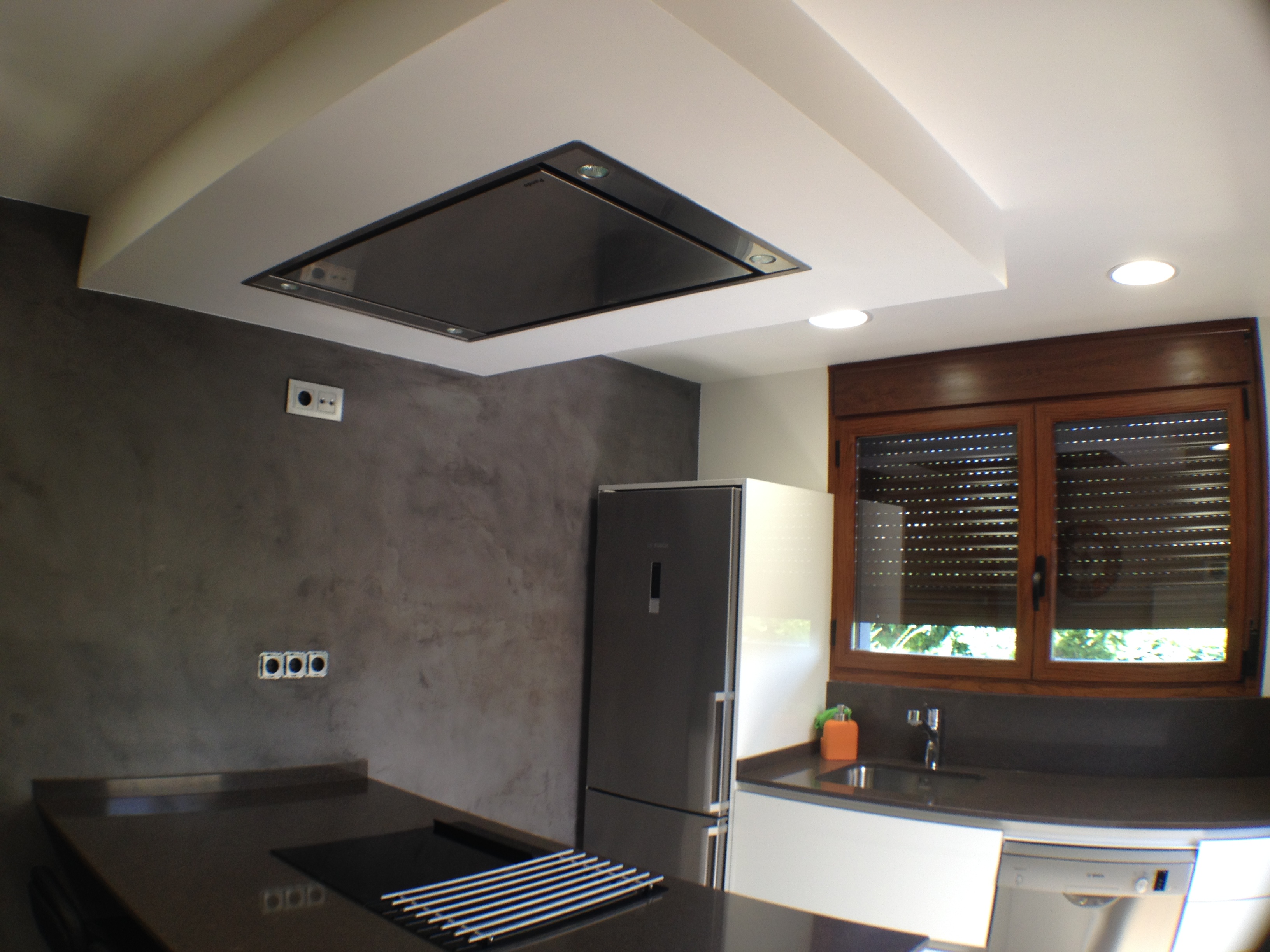 Detalle: la campana extractora está encastrada en el techo, sobre la isla en la que se sitúa la zona de cocción.
